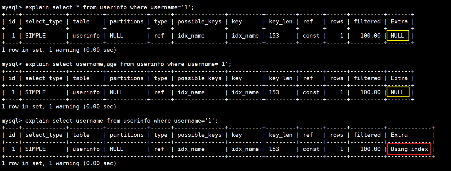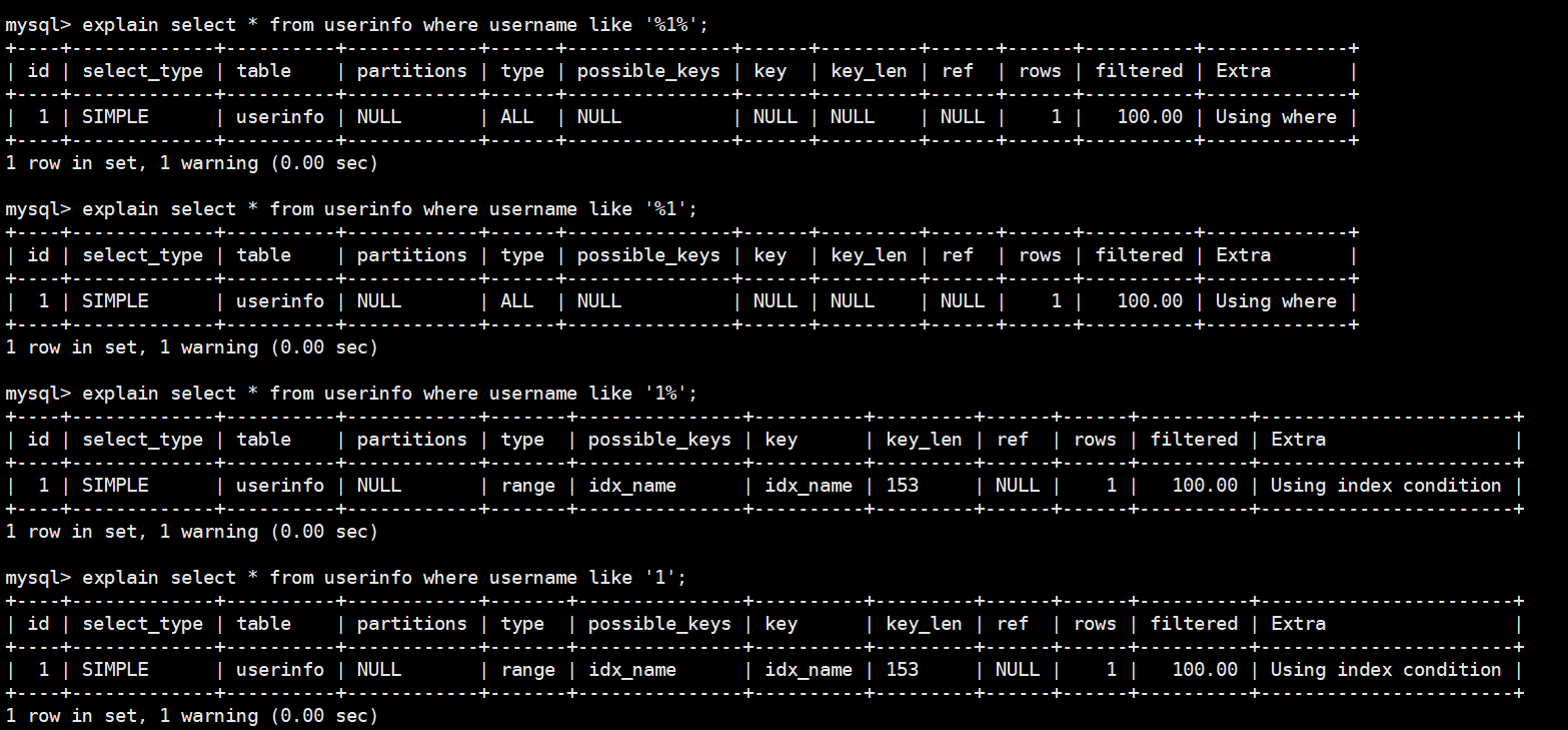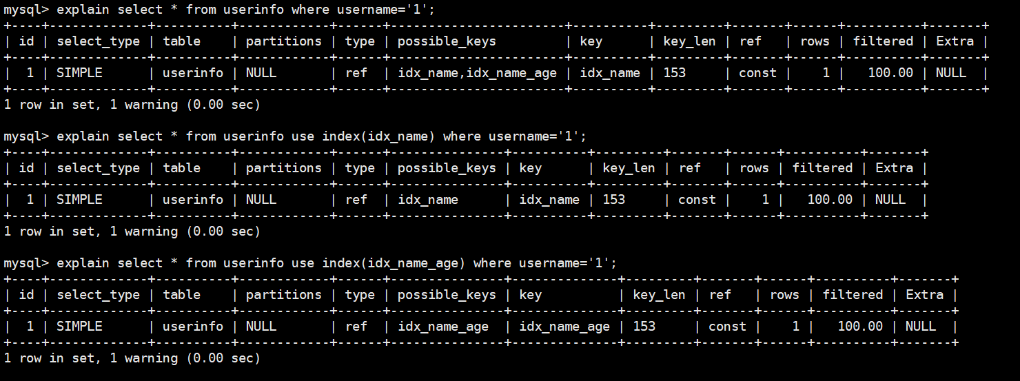 explain select * from userinfo use index(idx_name) where username='1';