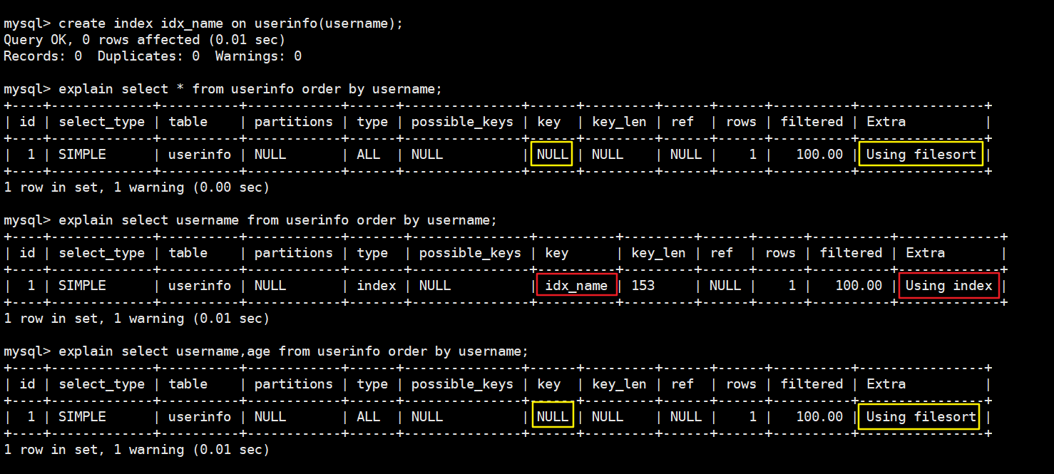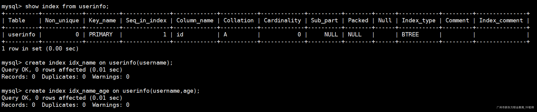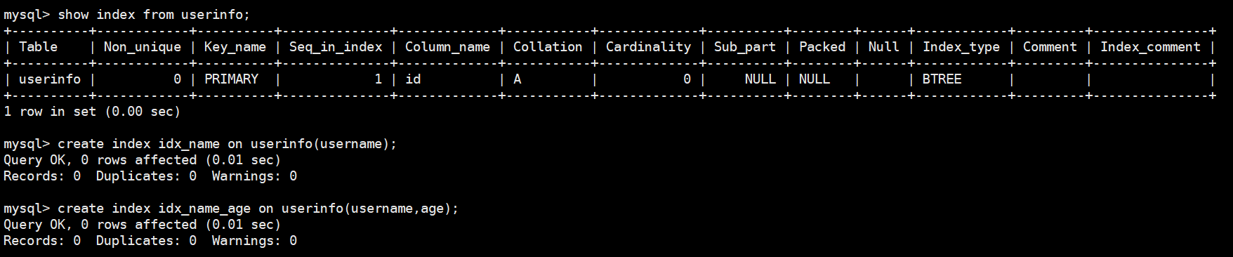 create index idx_name on userinfo(username); -- 给username创建单列索引