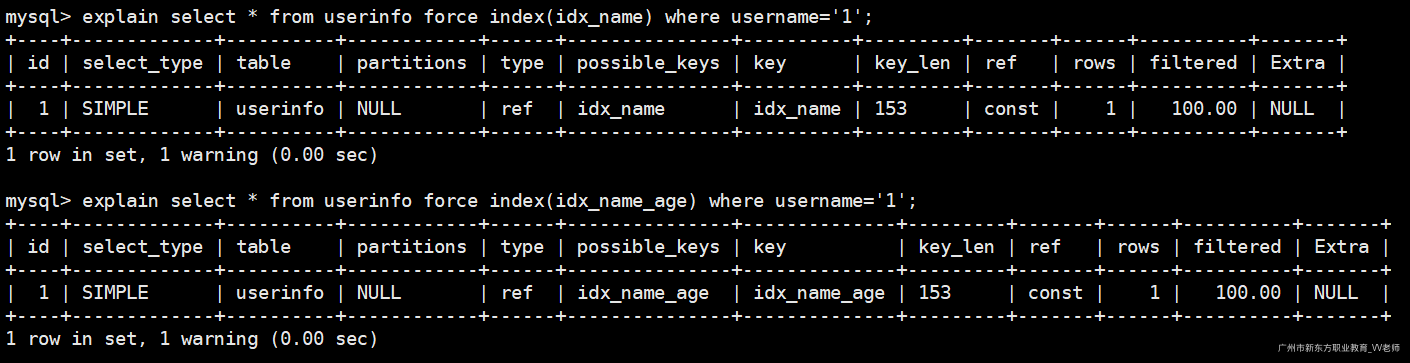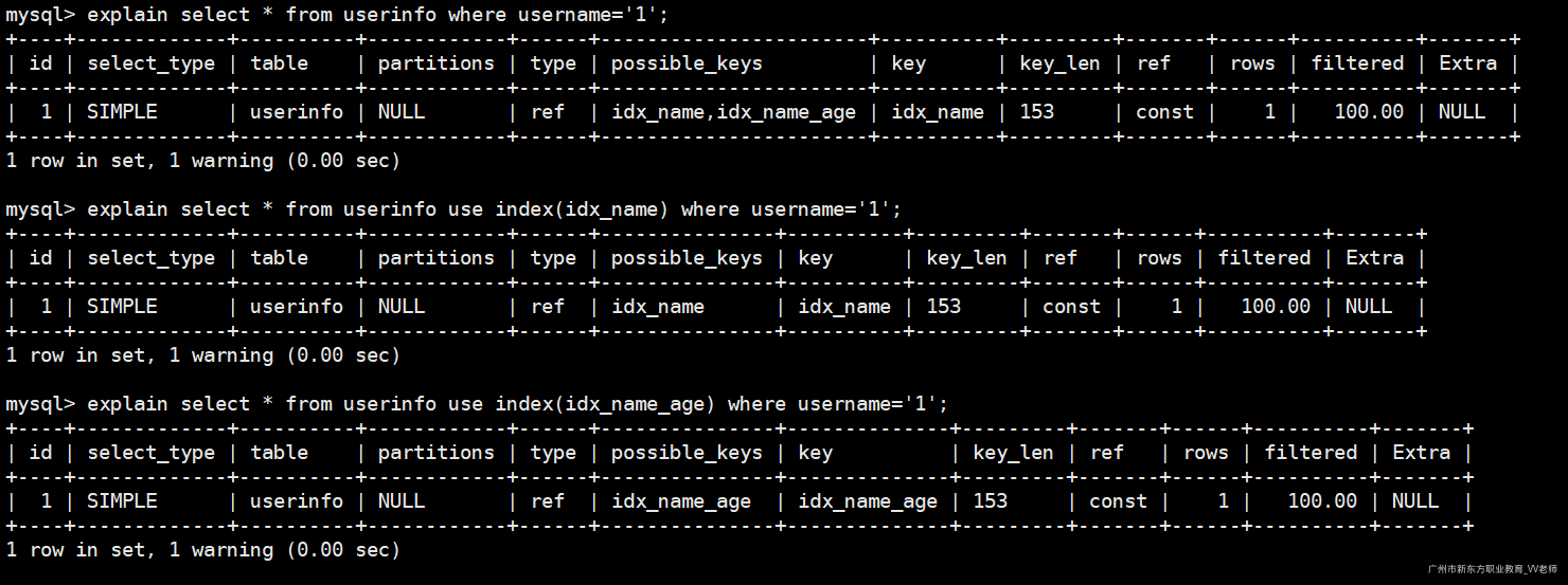 使用use、force都可以让MySQL强制使用某个索引,效果是一样的: