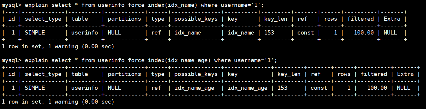 explain select * from userinfo force index(idx_name) where username='1';