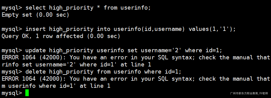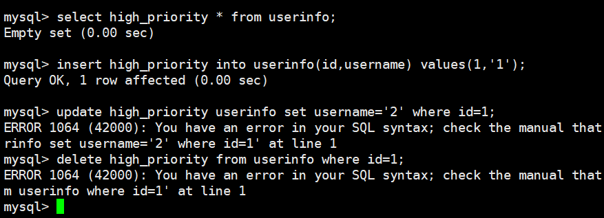 delete high_priority from userinfo where id=1; -- 语法错误