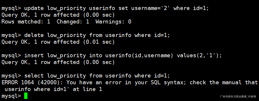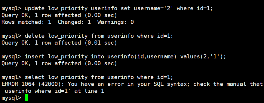 select low_priority from userinfo where id=1; -- 语法错误