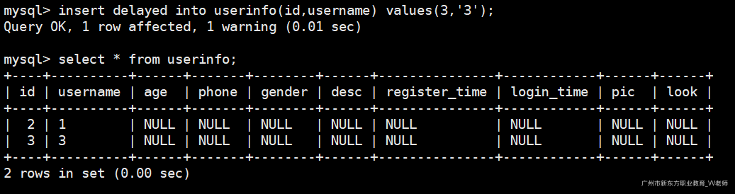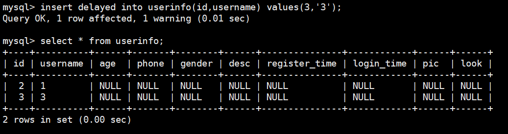 insert delayed into userinfo(id,username) values(3,'3');