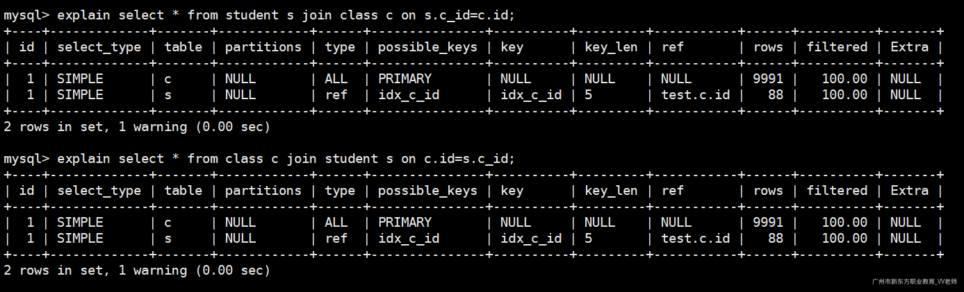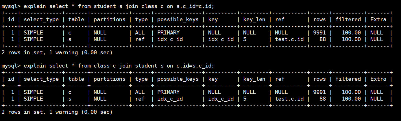 explain select * from student s join class c on c.id=s.c_id;