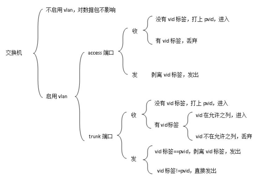 Access端口负责接终端设备,他收到一个帧的时候,如果帧这个没有标记他就用自己的pvid给他打上标记,他在发出一个帧时如果VID=PVID就去掉标记(解标记)以保证传送给终端设备的帧没有被变动过(中间设备添加了标记),pvid是在划分vlan时候每个端口都有的属性,默认情况下思科交换机中每个端口初始pvid是1,表示他是vlan 1的成员们如果你给他划分了其他VLAN那么PVID相应会发生更改,