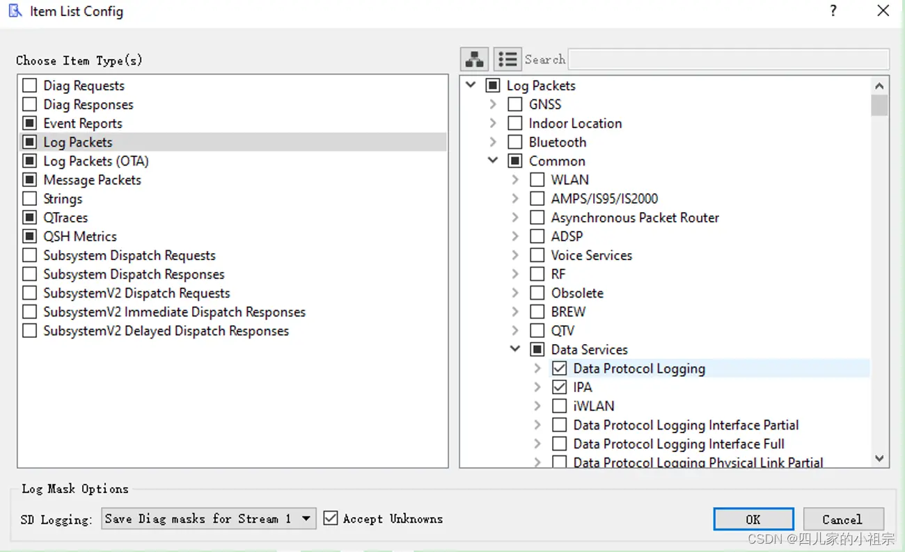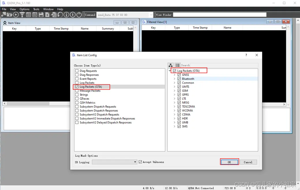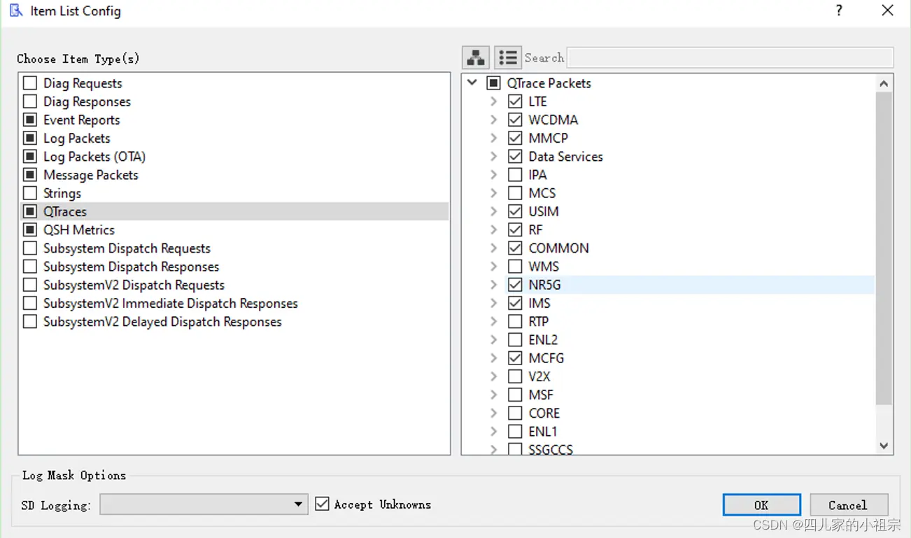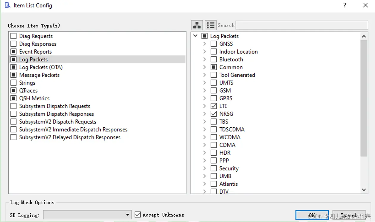 Log Packets(OTA)中一般必须勾选LTE、NR5G、WCDMA、UMTS、IMS。