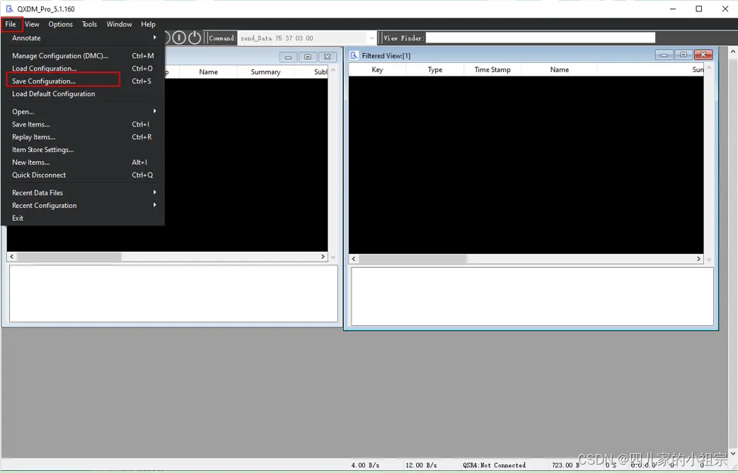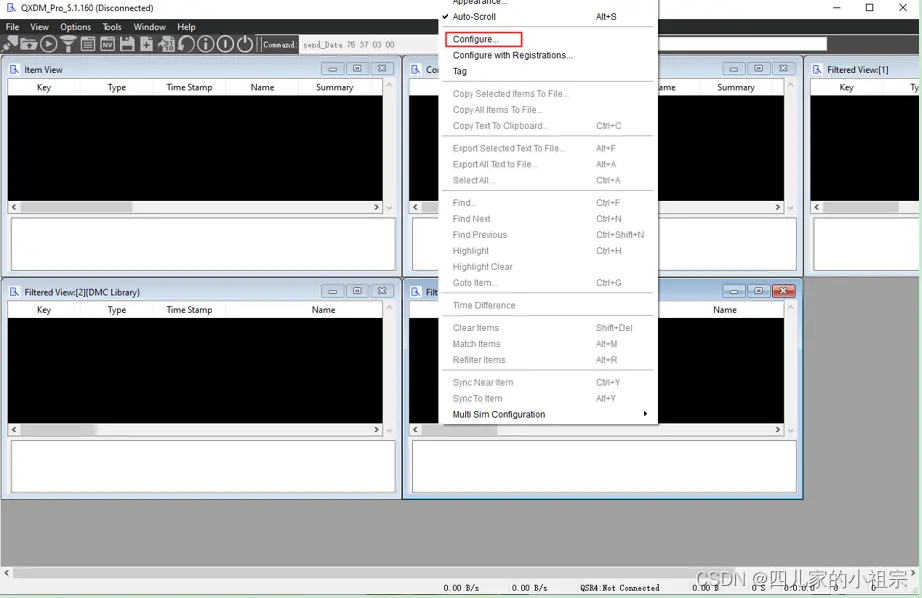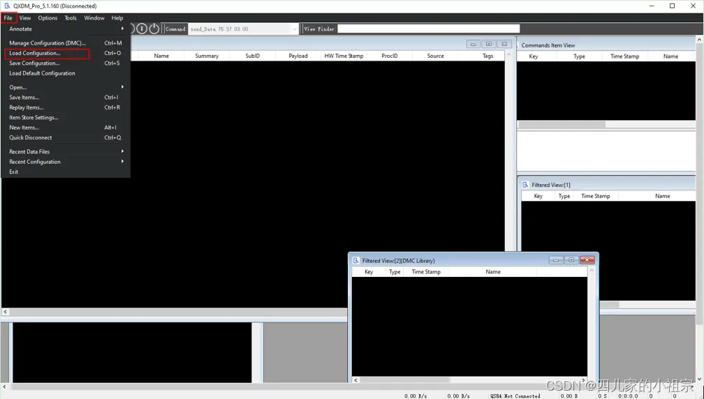 比如我们要抓开机后不能注册到4G问题的dmc文件由核心模块厂家提供。打开QXDM后,选择File--->LoadConfiguration装载dmc文件,或是直接双击dmc文件同时还可以打开QXDM,这种方式更方便。