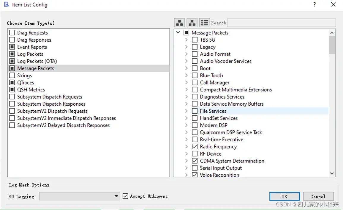 Message Packets中勾选Date Service、UMTS、LTE、NR5G、Linux Data、USIM、Radio Frequency、MMODE QMI等。Date Service显示AT指令相关信息,Linux Data显示AP侧相关信息,USIM显示SIM卡相关信息。选择性勾选IMS、MCFG、Policy Manager,如果需要抓取语音、短信相关log,勾选Voice Recognition、Wireless Messaging Service。