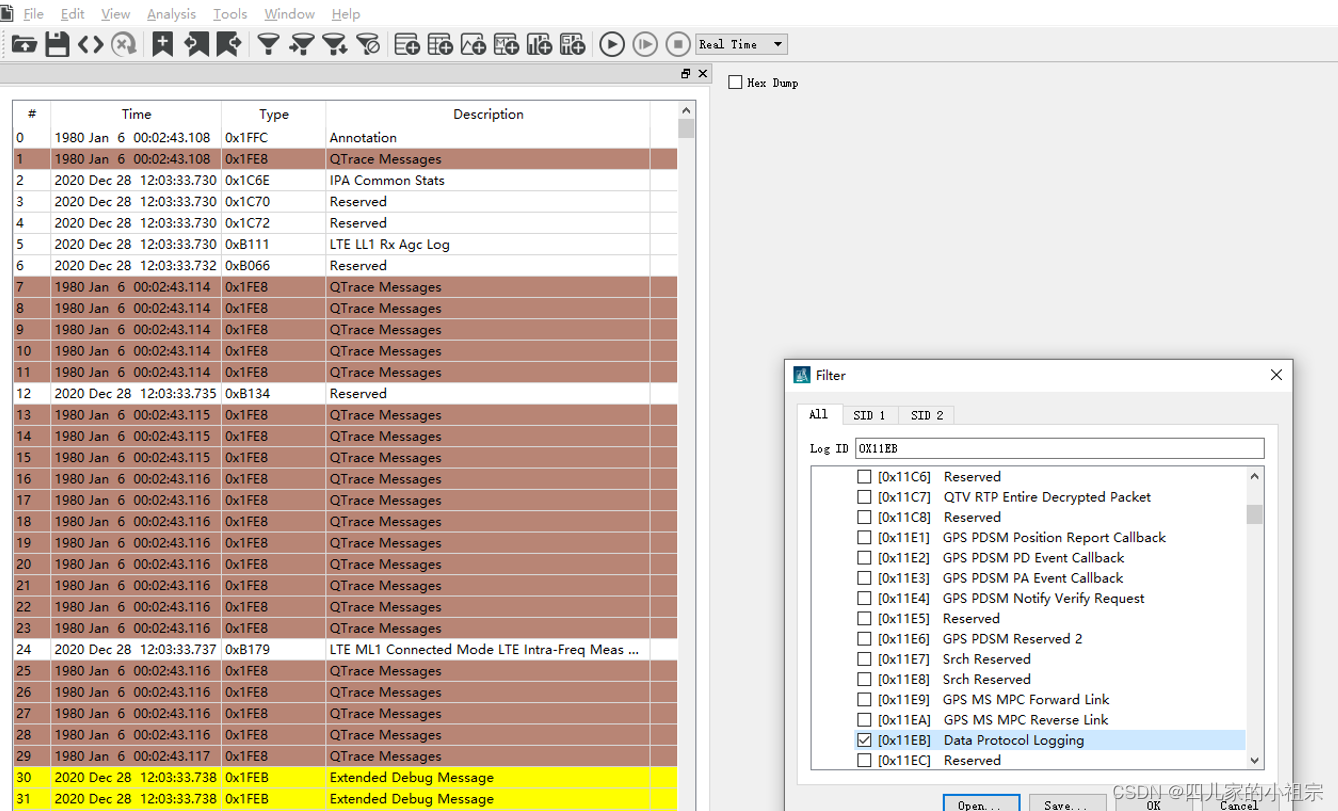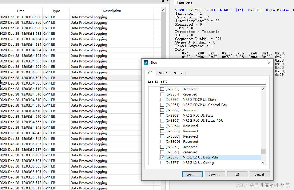 上网问题在上述的基础上Log Packets中必须勾选LTE、NR5G中的RLC、DHCP,Common中Data Service需要勾选Data Protocol Logging和IPA,Data Protocol Logging为数据包,IPA可以查看速率。配置好的Filter见附件,Windows平台下为Demo_TCPIP_Windows.dmc,Linux平台下为Demo_TCPIP_Linux.cfg