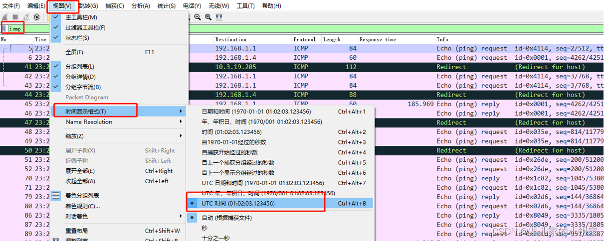 - 在PCAP log中,输入icmp过滤出Ping包信息,选择试图->时间显示格式->UTC时间,将时间显示格式设置和UE一样,下图以时延高为例: