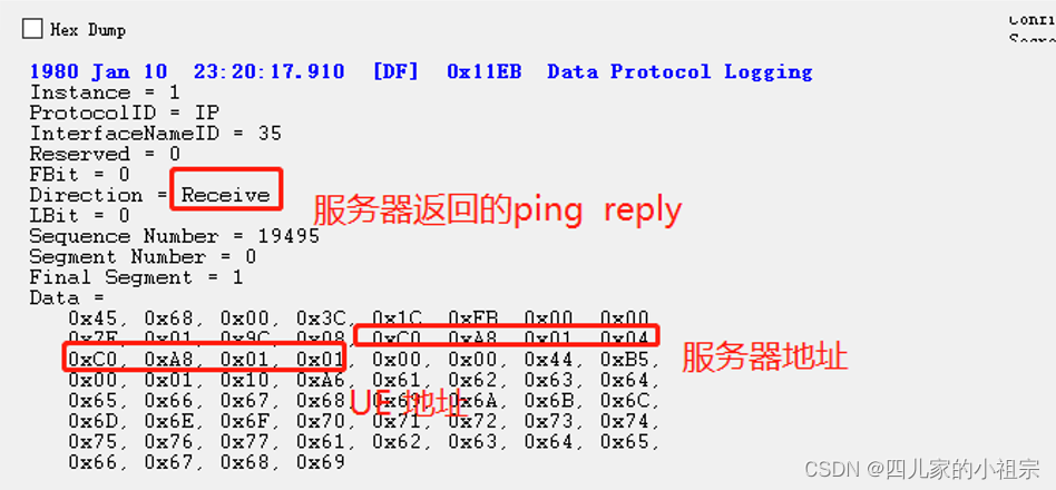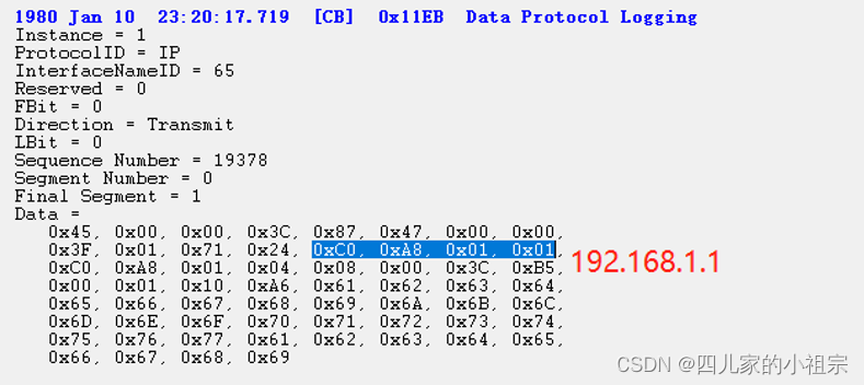 - 在QCAT log中过滤出消息,并找到与上面Data内容相同,且时间点对应的数据包(上图中,源IP为192.168.1.1, 服务器地址为192.168.1.4)