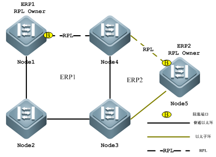 RPL(Ring Protection Link,环保护链路):每个以太环(不论是普通以太环还是以太子环)都有且仅有一条RPL。当以太环处于Idle状态时,RPL链路处于阻塞状态,不转发数据报文,以避免形成环路。Node1与Node4间的链路为以太环ERP1的RPL链路,Node1阻塞RPL端口(RPL链路所在的端口);Node4与Node5间的链路为以太环ERP2的RPL链路,Node5阻塞RPL端口。