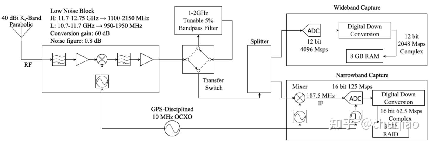 信号捕获系统允许在窄带(∼60MHz)和宽带(∼1GHz)之间进行选择。对于窄带模式,LNB的输出馈送到转换开关,该转换开关通过可调谐带通滤波器转换信号,用于镜像抑制。然后下游硬件执行下变频(与所选频段一致),额外的带通滤波和16位62.5Msps的复数采样。LNB中的下变频操作,和下游的下变频和采样操作,使用通用GPS控制的晶体振荡器(OCXO)锁相,以最大限度地减少接收机时钟变化对接收信号的影响。3TB数据存储阵列允许存档数小时的连续数据。