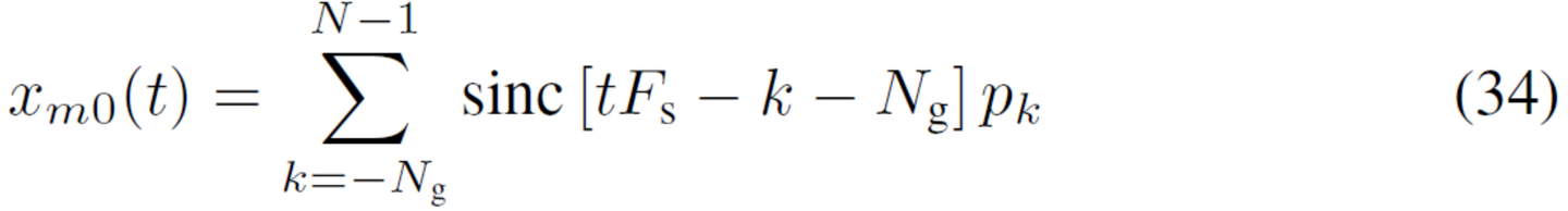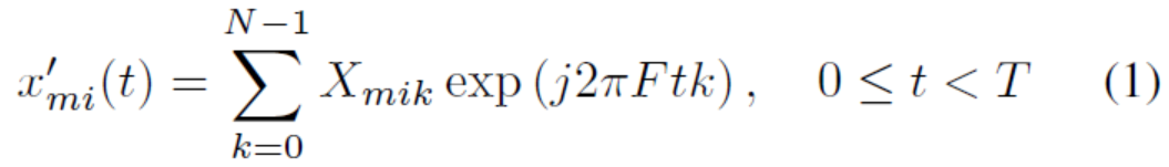 将此表达式表示为离散傅里叶反变换,通常作为IFFT实现。因此可以将每个Xmik视为一个复值频域系数。防止由于多径信道引起的符号间干扰(ISI),OFDM为每个符号预置循环扩展长度Tg =Ng/Fs的保护间隔,称为循环前缀。由于IFFT的时间循环性质,通过对(1)的简单修改可以对预置操作进行建模: