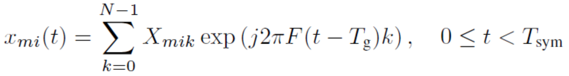 通过添加循环前缀,OFDM符号区间变为Tsym =T+Tg,其中T是有用的(非循环)符号间隔。函数xmi(t)称为OFDM符号,或简称为OFDM符号,如果与其频域表示法几乎没有混淆的风险时。