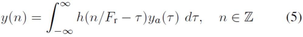 在图1所示的信号捕获流水线的后期阶段,模拟信号ya(t)是离散化的。让Fr成为接收者的采样速率,h(t)是低通的脉冲响应,具有(双侧)3dB带宽Fh < Fr和滚降的预滤波器,使得频率|f|>Fr/2的功率可以忽略不计,允许无混叠复采样。基带数字化接收信号模型为: