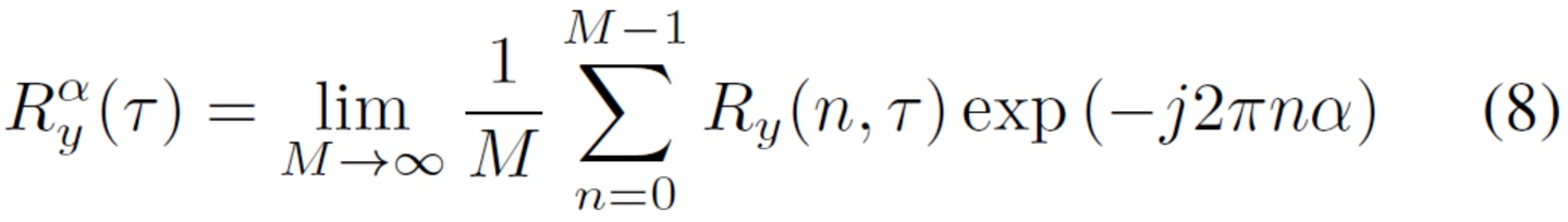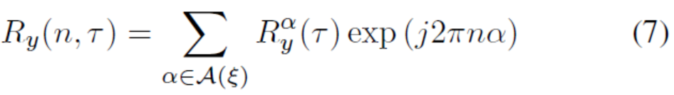 其中A(ξ) ={p/ξ:p∈Z}。特定集合A(N+Ng)包含所谓的循环频率。傅里叶系数Rαy(n, τ),也称为循环自相关函数,等于