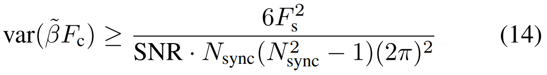 其中Fc是OFDM信道的中心频率,ε受到限到百分之几[17]。假设已知帧中存在的同步符号允许调制擦除Nsync个连续样本,从相干载波信号可以估计β。在未知相位和幅度进行频率估计问题时,由克拉姆尔-拉奥界给出一个Fc方差的低限[23]: