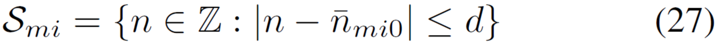 设是通过检查y(n)的功率谱获得。这可以通过单个宽带捕获,或通过重叠窄带扫描跨越整个信道的捕获。请注意,除了之外,还可以从这次检查中获得信道中心频率Fc的猜测。请记住,即使在高SNR下,不可能从功率谱来精确确定Fs,因为靠近OFDM信道边界的子载波可以保持未调制状态,以提供频率保护间隔[17]。设Nr =⌊NFr/Fs⌉为区间T =N/Fs中有用符号接收机样本的近似数量,其中⌊·⌉表示舍入到最接近的整数。同时设η =Fr/作为估计的采样率比率,并假设|−Fs|/ Fs < p,0<p≪1。然后对于每个b∈S,一组对应的Nr值可以构造以解释中的不确定性:
