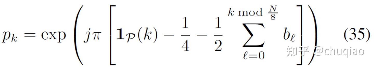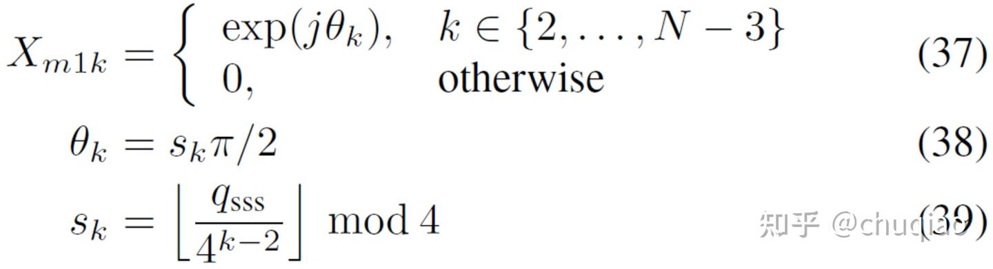 其中1P(k)是指示函数,等于单位k∈P否则为零,P ={k∈Z:k<N/8}。指示函数对k<N/8将相位旋转π,以反转循环前缀和第一次重复的PSS子序列。PSS亚序列(pk)2N/8−1k =N/8是一个长度127的最大长度线性反馈偏移的寄存器(LFSR)序列(m序列)的对称差分相移键控(对称DPSK) 编码。在这种调制中,m序列的每个位表示正或负π/2相位旋转。m序列可以使用7阶斐波那契LFSR,具有原始多项式1+D3+D7和初始状态(a−1,...,a−7) =(0,0,1,1,0,1,0,0),遵循[24]中的转换。假设LFSR的输出a0,a1,...,a126存储为127位数字,a0存储为MSB和a126作为LSB。将此数字追加0将产生出现在(36)中的128位十六进制数: