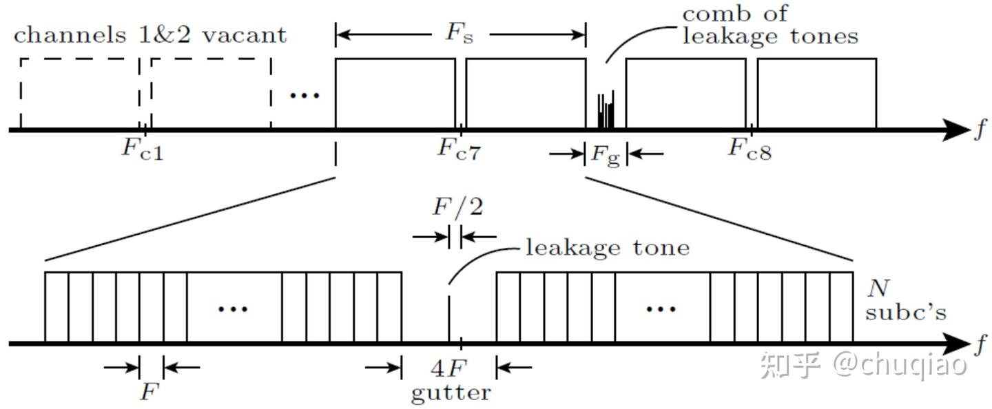 每个频道中央的4个子载波都是空的,留下信道中暗沟。在OFDM实践中保留这样的暗沟很常见,否则,接收机的混频泄漏可能会损坏中央的信息符号。在Starlink的情况,发射器侧一些单音泄漏出现在卫星的暗沟。有趣的是,第i个频道的中心频率Fci,比信道的中点高F/2,它位于中信道暗沟的中心。一个暗沟泄漏单音(如果存在)位于中点。