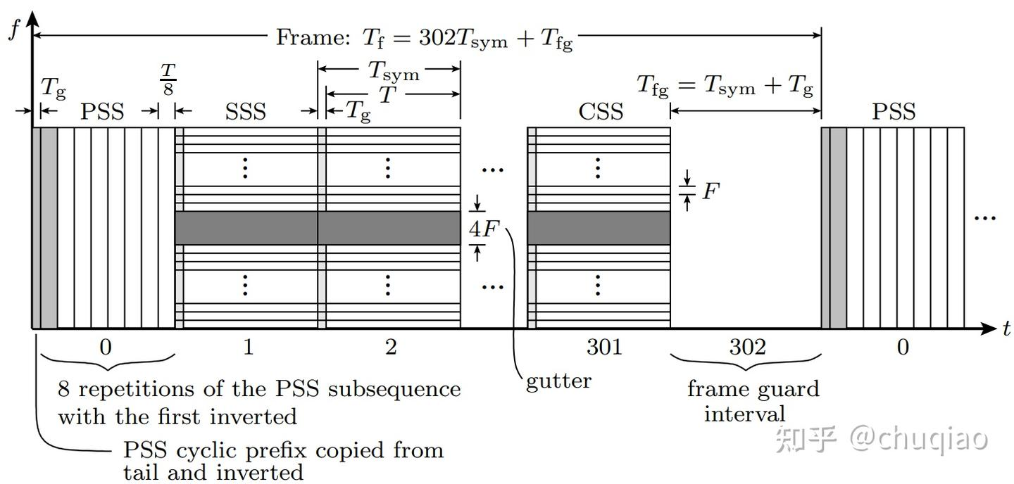如图6所示。每帧由302个间隔组成,每个间隔加上帧保护间隔Tfg,长度Tsym =4.4μs,总帧周期为Tf =1/750s。每一帧都以PSS开始,它在本地时域中表示,其次是SSS,其格式为标准4QAM OFDM符号。每一帧以CM1SS结尾,后跟CSS和帧保护间隔。后续帧是否存在,取决于用户需求。