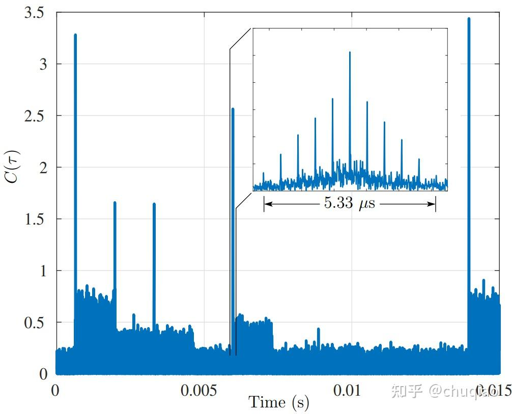 图7:多普勒补偿后的窄带模式接收的Starlink数据与本地PSS副本的相关性
