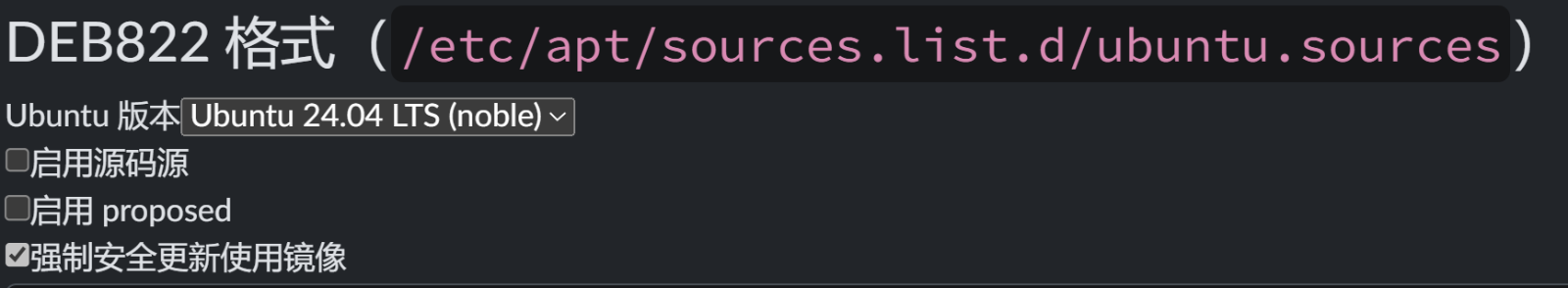 Ubuntu 24.04 以上版本的使用 DEB822 格式而不是传统格式,勾选强制安全更新使用镜像(因为不是生产环境,所以勾选没问题,能加快软件包安装速度)