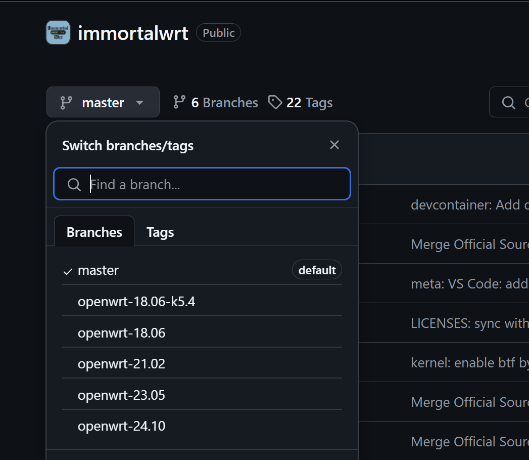 上面的 -b 参数指的是分支,目前最新的分支是 openwrt-24.10 ,在GitHub 界面的 Code 中查看。(别手贱选 master 或 main ,这些开发分支什么也没有配置,包括 luci )