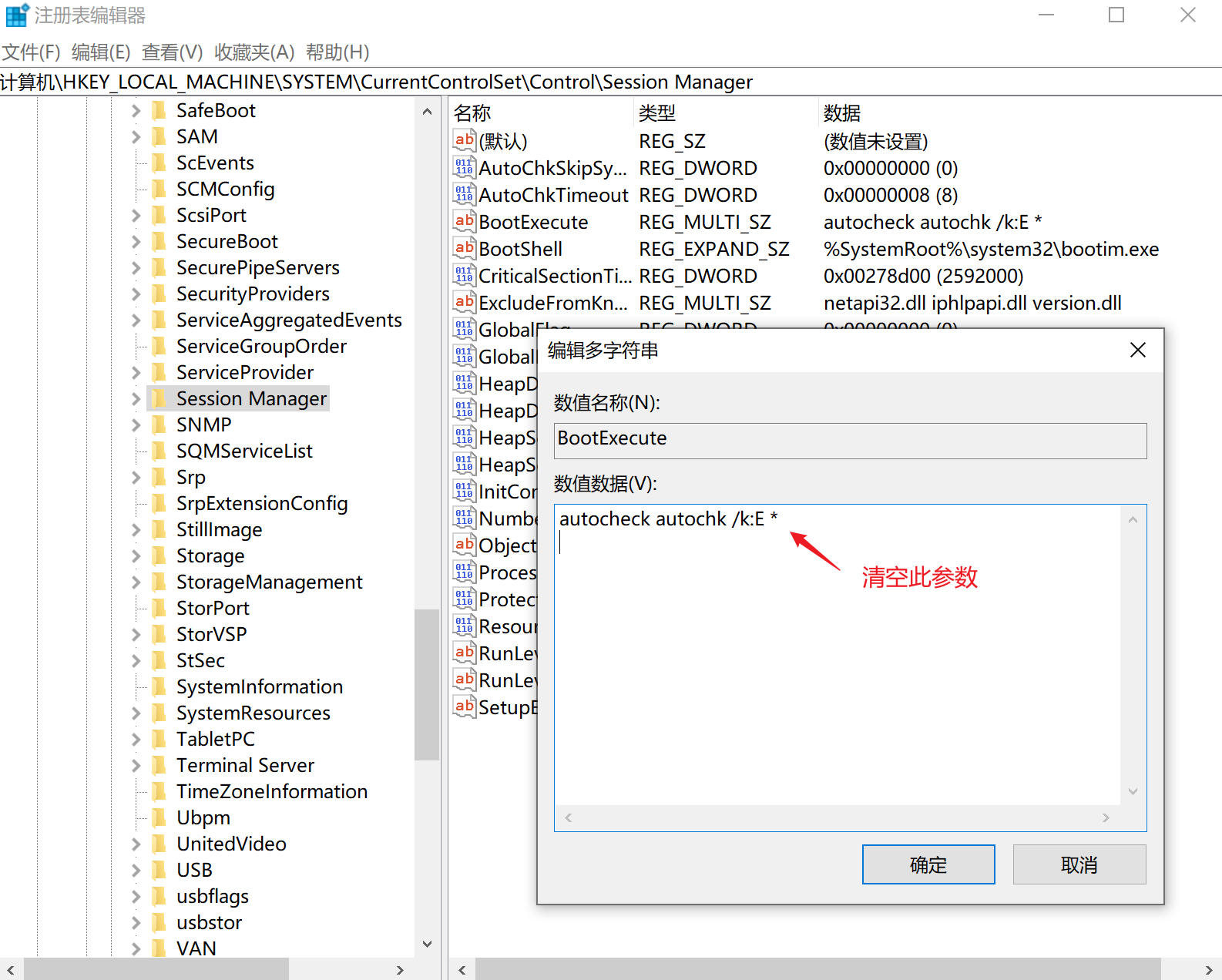 清空 计算机\HKEY_LOCAL_MACHINE\SYSTEM\CurrentControlSet\Control\Session Manager 的 BootExecute 的参数