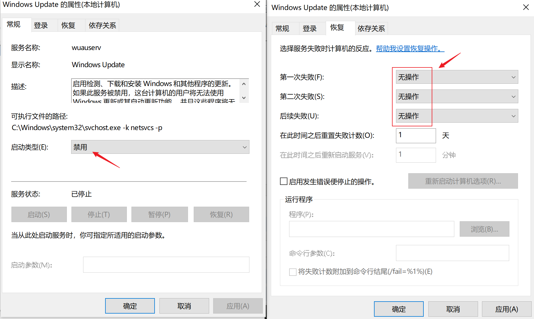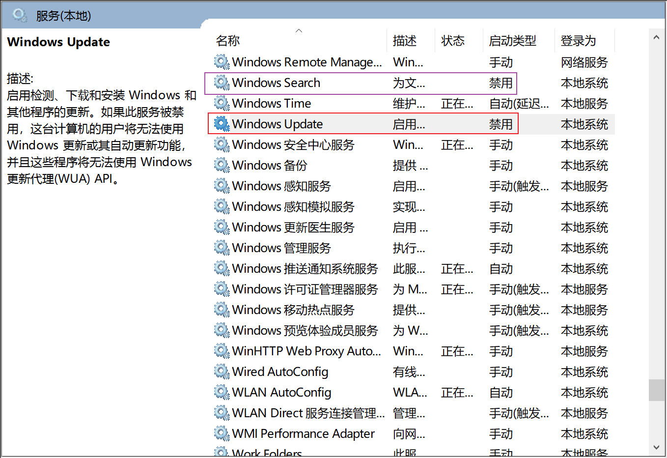 把Windows Update和Windows Search服务也禁用掉,重启,上面那俩破服务就变成 “手动”“已停止”状态了,这个时候去注册表禁用掉这俩破服务,就清净了。