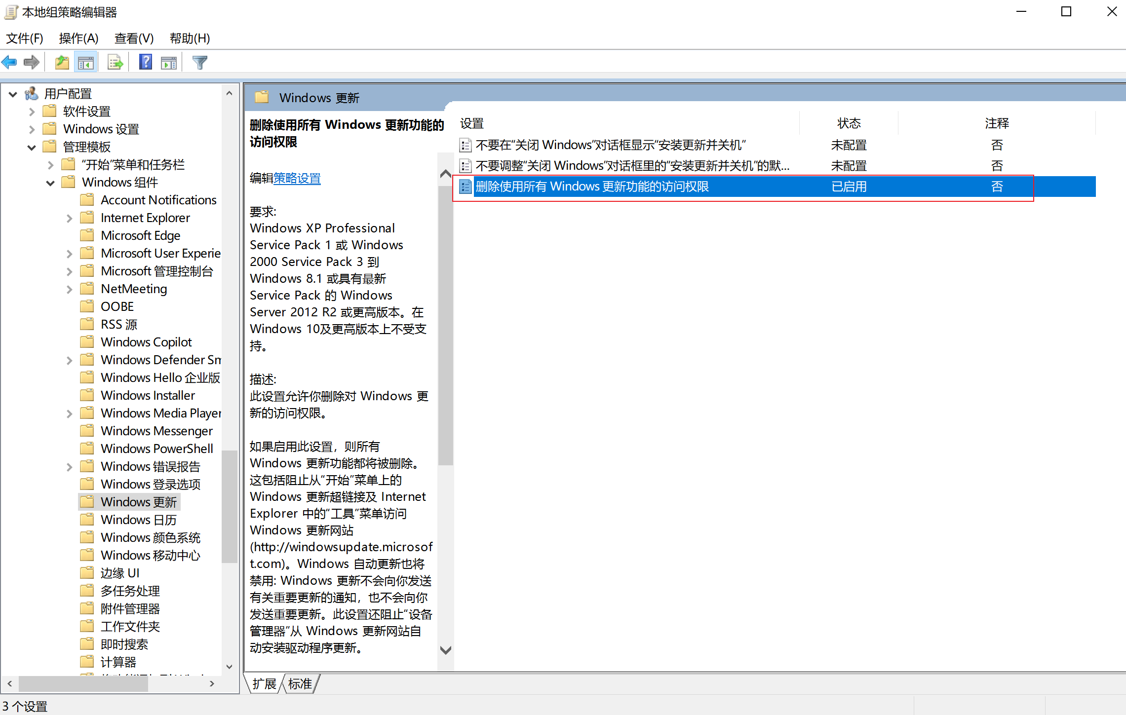 运行 gpedit.msc 找到 用户配置-》管理模板-》Windows组件-》Windows 更新