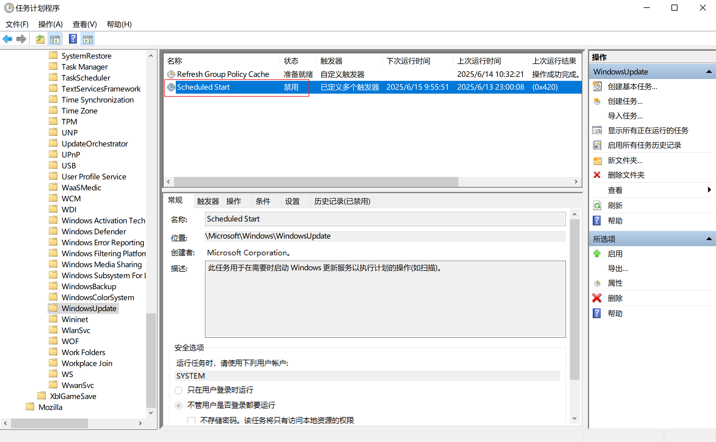 运行 taskschd.msc 找到 任务计划程序库-》Microsoft-》Windows-》WindowsUpdate