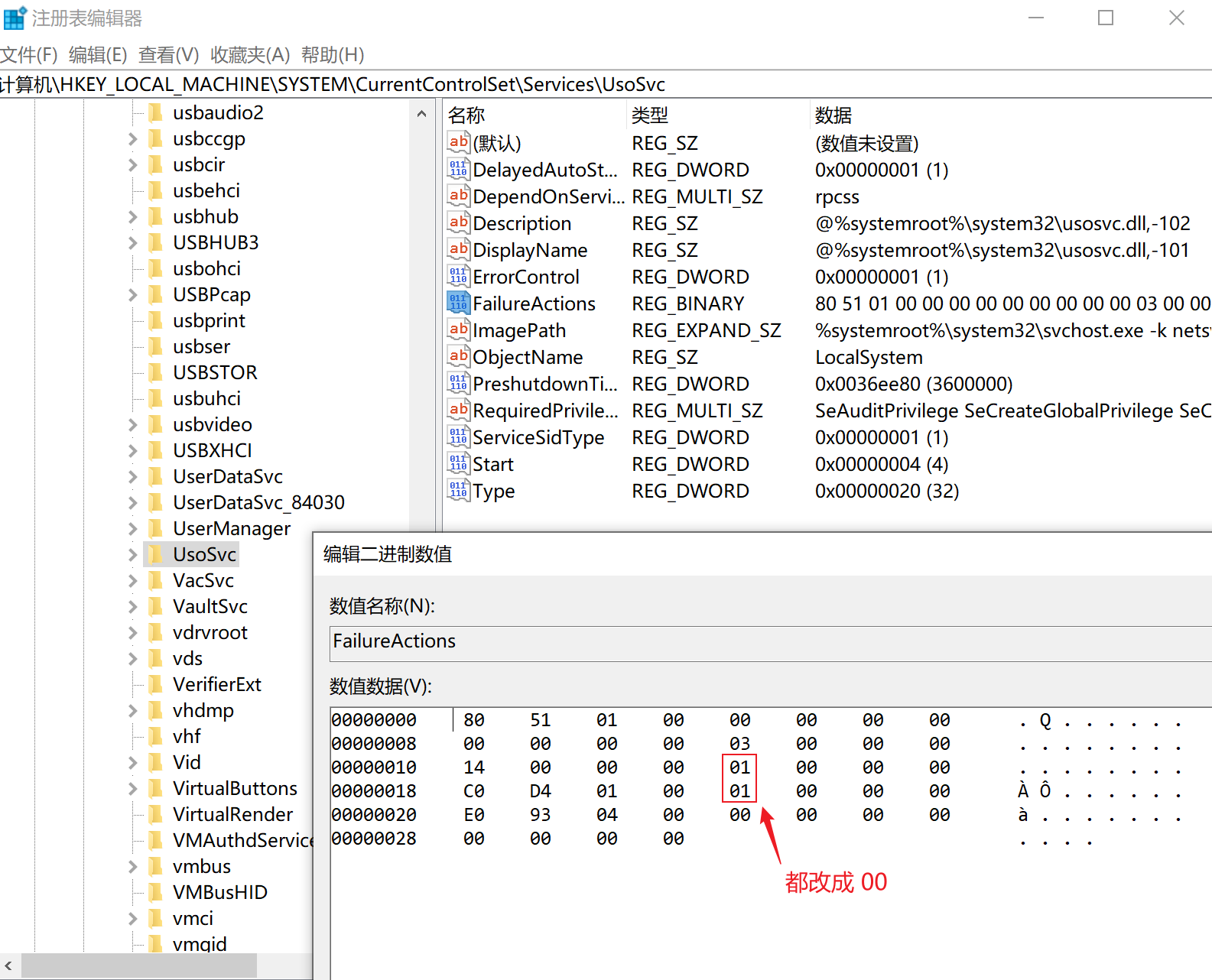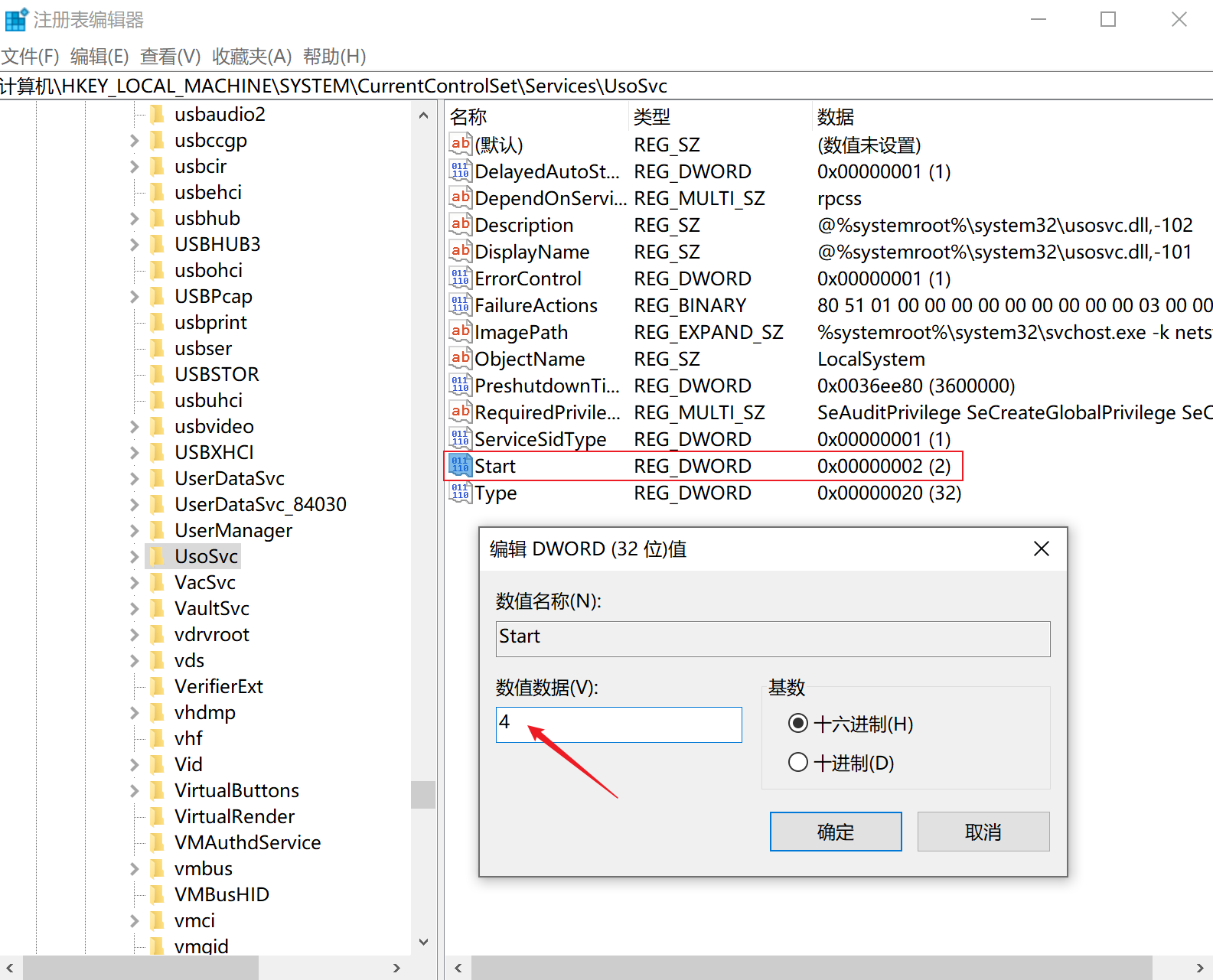 运行 regedit 找到 计算机\HKEY_LOCAL_MACHINE\SYSTEM\CurrentControlSet\Services\UsoSvc