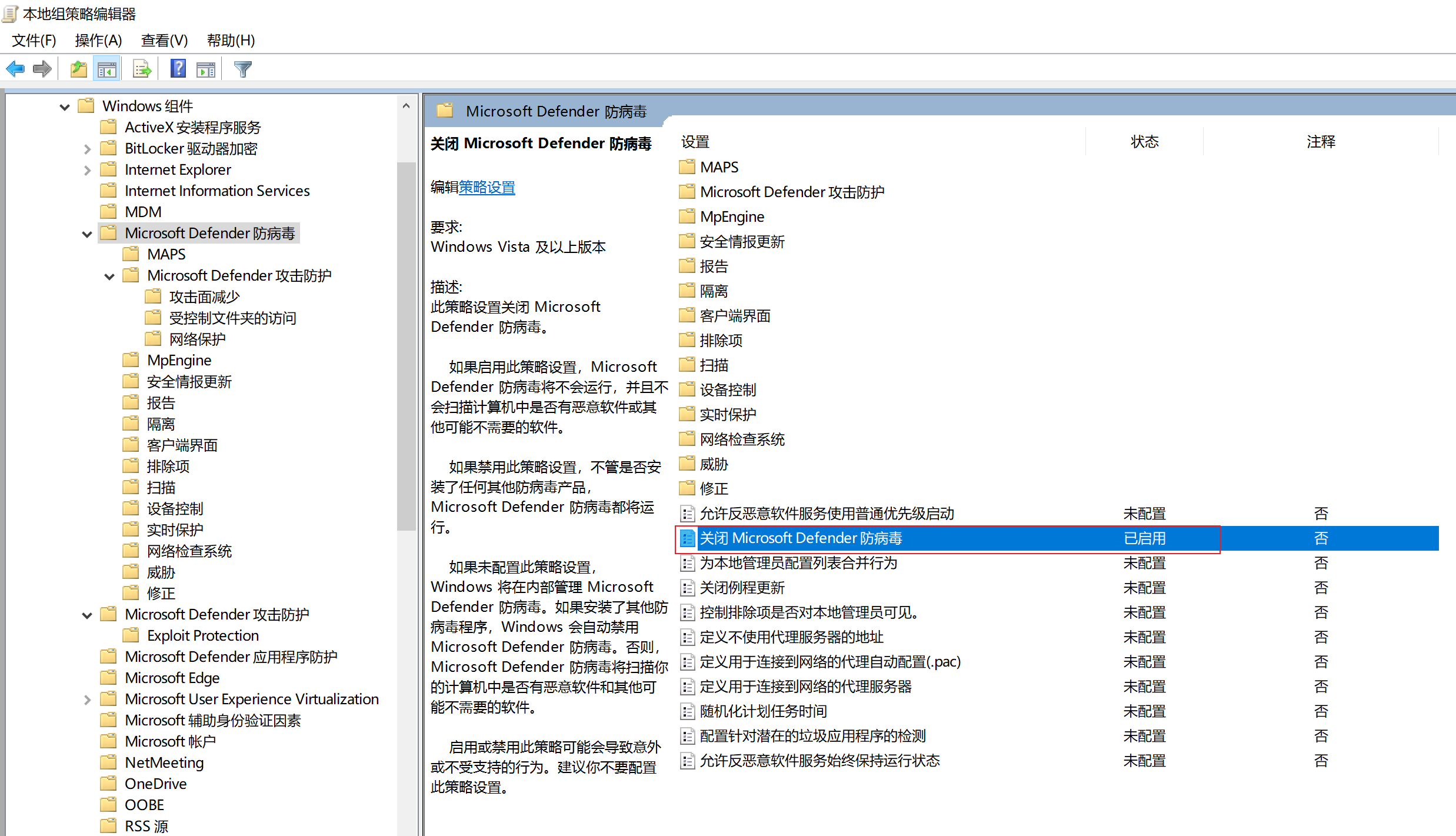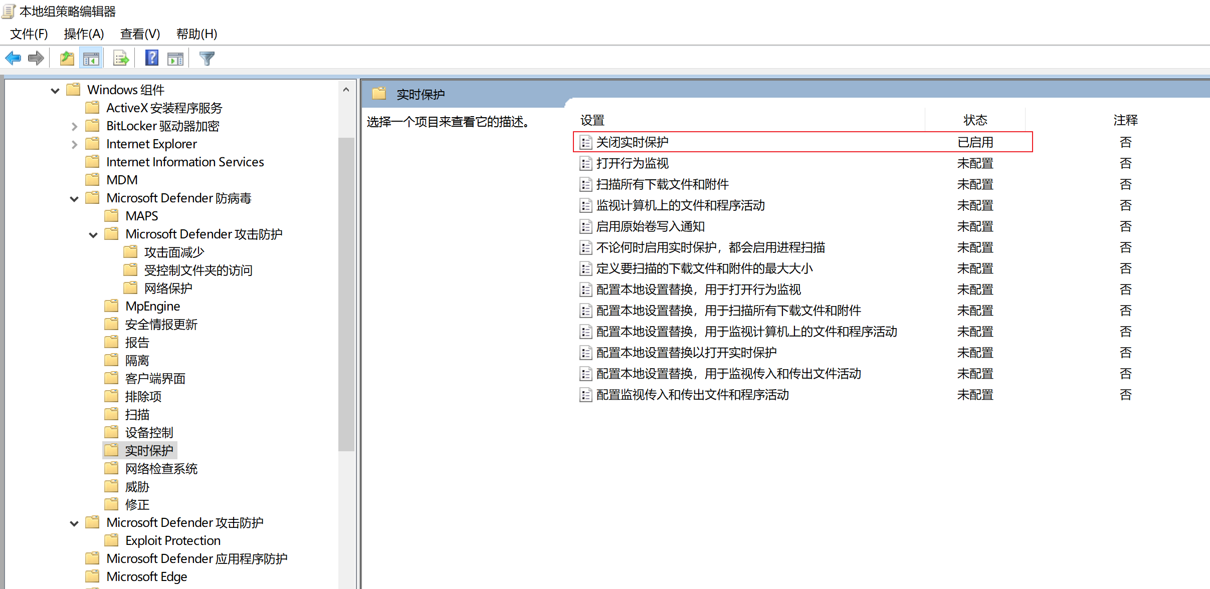 计算机配置 - 管理模板 - Windows 组件 - Windows Defender 防病毒程序关闭 Windows Defender 防病毒程序实时保护关闭实时保护
