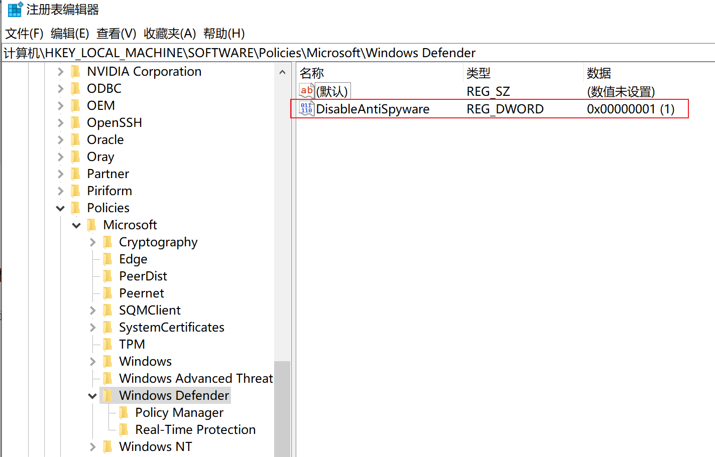 计算机\HKEY_LOCAL_MACHINE\SOFTWARE\Policies\Microsoft\Windows Defender- 键