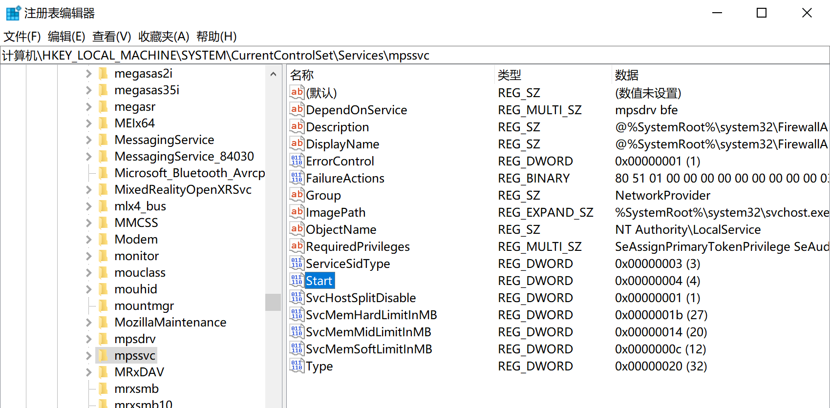 需要将 [HKEY_LOCAL_MACHINE\SYSTEM\CurrentControlSet\Services\mpssvc] 的服务 设置为自动启动 "Start"=dword:00000002