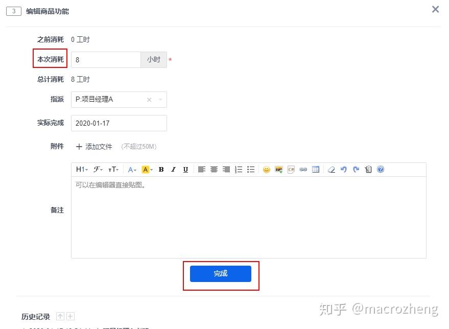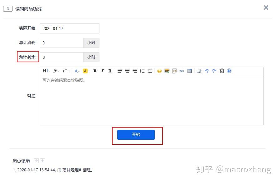 - 任务开始时需要填写自己的预计剩余时间,最初预计工时可以在编辑任务里设置: