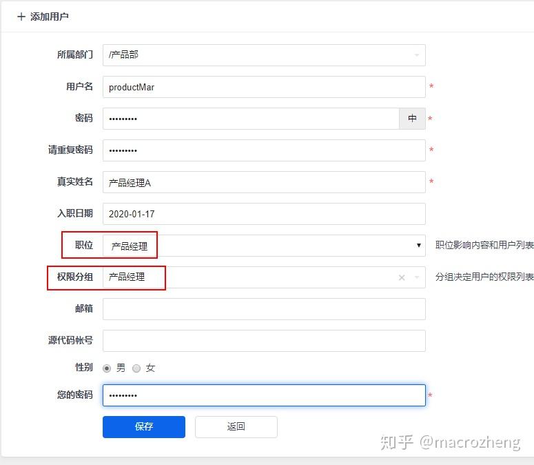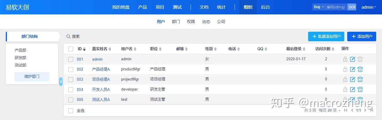 - 这里我们添加了产品经理、项目经理、研发主管、测试主管四个账号以便下面使用。