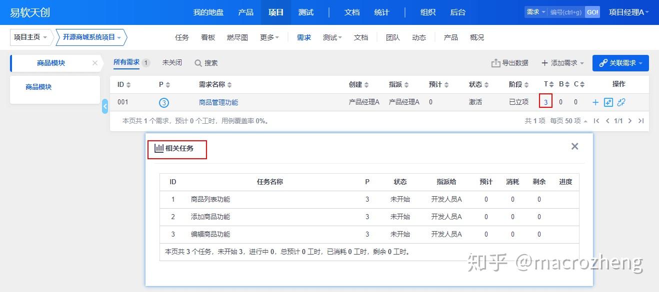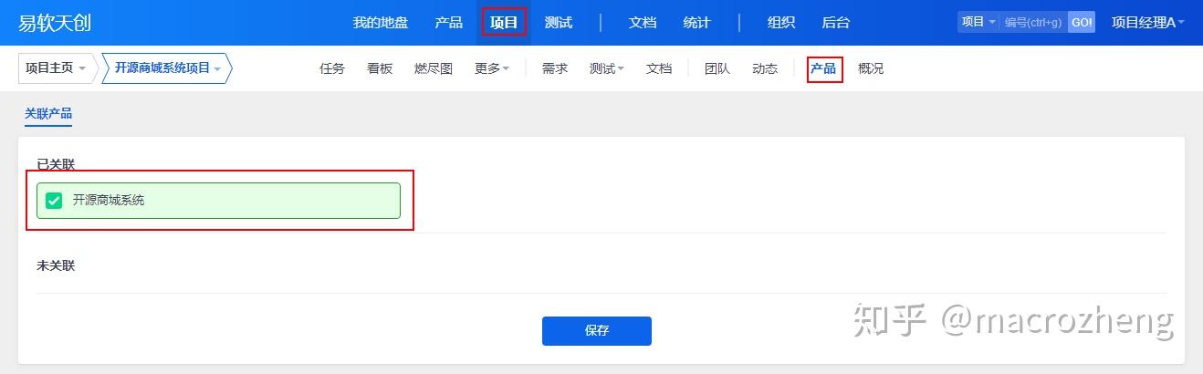 - 项目团队组建完毕之后,项目经理通过关联产品即可将项目和产品进行关联: