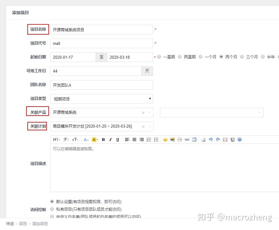 - 创建时需要完善项目信息,设定项目开发时间以及关联相关产品与计划: