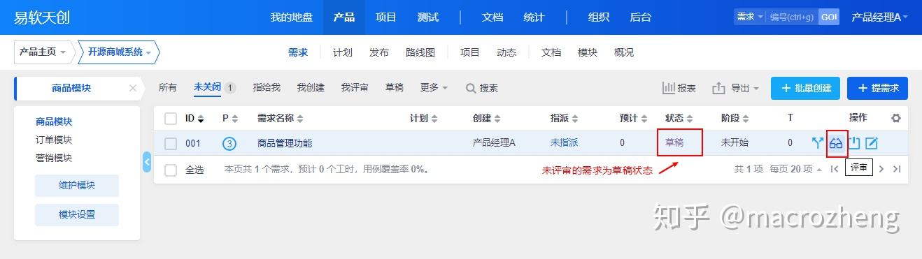 - 创建完需求后还需要对需求进行评审操作,只有评审通过的需求才会由项目经理进行任务分解,从而转为为开发任务指派给开发团队: