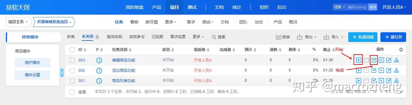 - 开发人员开始做任务时点击开始按钮,完成任务时点击完成按钮: