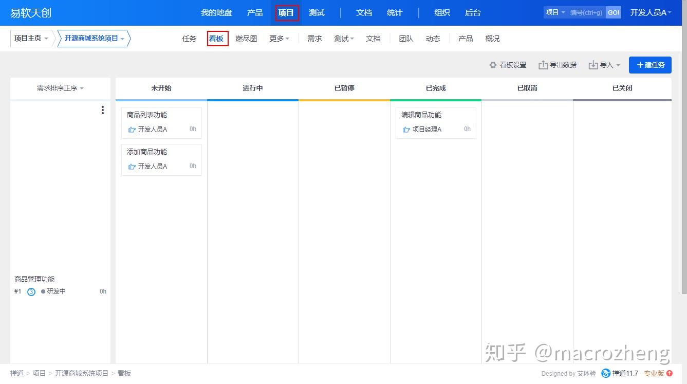 - 物理介质的看板比较直观,是Scrum标准的管理工具,禅道里面也有一个电子看板: