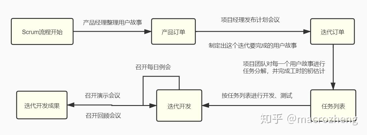 - 回顾会议:项目团队对本期迭代进行总结,发现不足,制定改进计划,下一次迭代继续改进,已达到持续改进的效果。