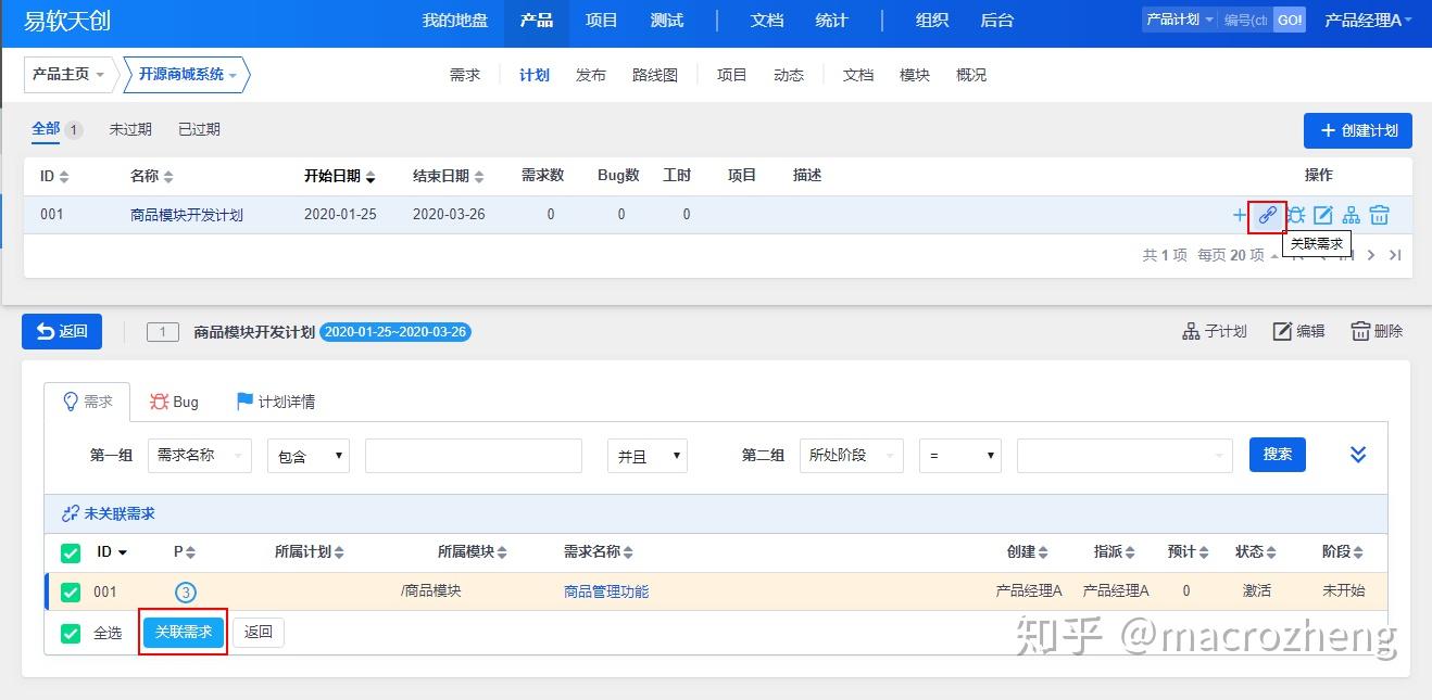 - 可以通过关联需求,指定此次产品计划需要完成的需求: