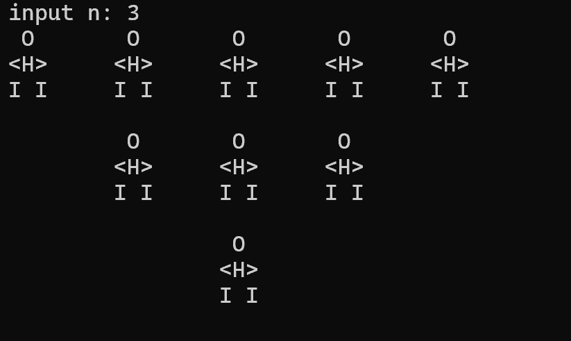 #include<stdio.h> int main() { int n, i, j; printf("input n: "); scanf_s("%d", &n); for (i = n; i > 0; i--) { for (j = 0; j < n - i; j++) printf(" \t"); for (j = 0; j < 2 * i - 1; j++) printf(" O \t"); printf("\n"); for (j = 0; j < n - i; j++) printf(" \t"); for (j = 0; j < 2 * i - 1; j++) printf("<H>\t"); printf("\n"); for (j = 0; j < n - i; j++) printf(" \t"); for (j = 0; j < 2 * i - 1; j++) printf("I I\t"); printf("\n"); printf("\n"); } return 0; }