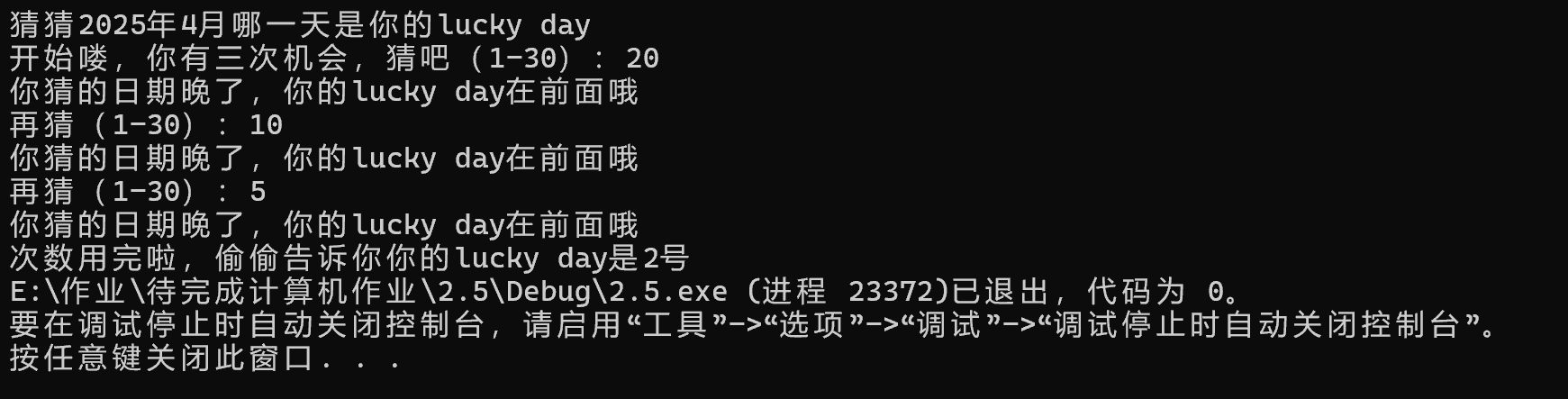 #include<stdio.h> #include<stdlib.h> #include<time.h> int main() { int i,n; srand(time(NULL)); int random_number = 1 + rand()%30; int x = random_number; printf("猜猜2025年4月哪一天是你的lucky day\n"); printf("开始喽,你有三次机会,猜吧(1-30):"); scanf_s("%d", &n); for (i = 0; i < 3; ++i) { if (n < x) { printf("你猜的日期早了,你的lucky day还没到呢\n"); } else if (n > x) { printf("你猜的日期晚了,你的lucky day在前面哦\n"); } else { printf("哇,猜中了:-)\n"); break; } if (i < 2) { printf("再猜(1-30):"); scanf_s("%d", &n); } else printf("次数用完啦,偷偷告诉你你的lucky day是%d号", x); } return 0; }