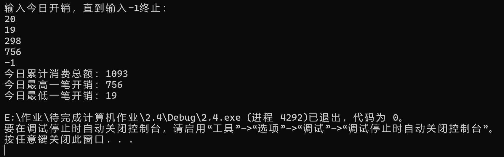 #include <stdio.h> int main() { int n,x,max,min; int sum; printf("输入今日开销,直到输入-1终止:\n"); scanf_s("%d", &x); max = x; min = x; sum = x; n = 0; while (1){ scanf_s("%d", &n); if (n == -1) break; if (n > max) max = n; if (n < min) min = n; sum += n; } printf("今日累计消费总额:%d\n",sum); printf("今日最高一笔开销:%d\n",max); printf("今日最低一笔开销:%d\n",min); return 0; }