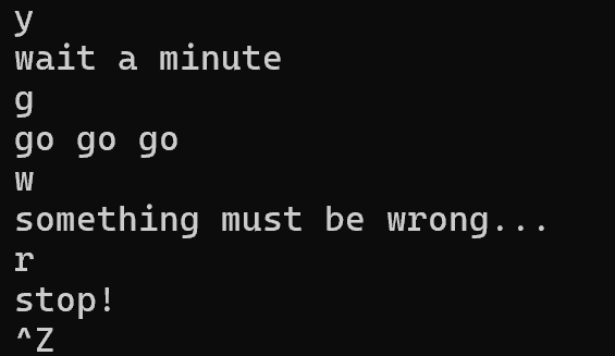 #define _CRT_SECURE_NO_WARNINGS 1 #include <stdio.h> int main() { char color; while (scanf(" %c", &color)!=EOF) { switch (color) { case 'r': printf("stop!\n"); break; case 'g': printf("go go go\n"); break; case 'y': printf("wait a minute\n"); break; default: printf("something must be wrong...\n"); break; } } return 0; }